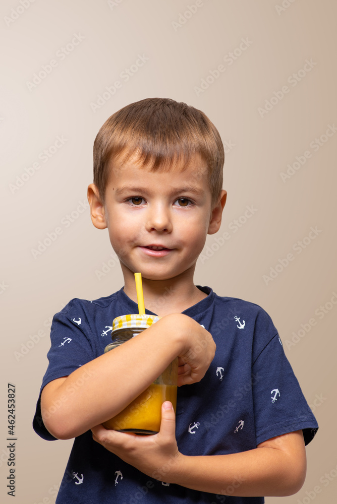 Boy with smoothie on a beige background.