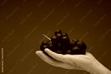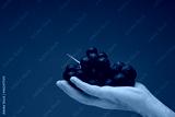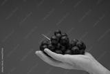 Fresh ripe blue grapes held in hand by Caucasian male hand. Close up studio shot, isolated on gray