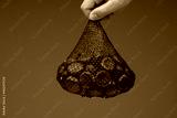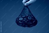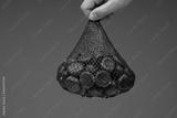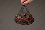 Raw edible chestnuts in a mesh plastic bag held by male hand. Close up studio shot, isolated on grayt