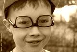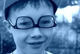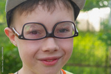Funny caucasian teen boy in inverted glasses jokes and laughs