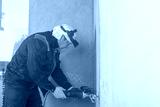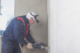 A worker cuts a groove in the wall with a grinder for installing electrical wiring