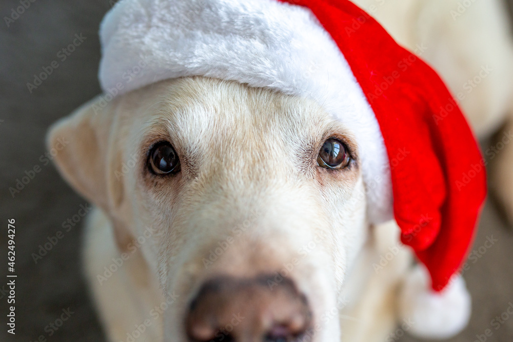 Christmas. The dog in the hat of Santa Claus. Santa Claus 2022. Labrador at Christmas. Dog for the new year. New year concept. Offended dog.