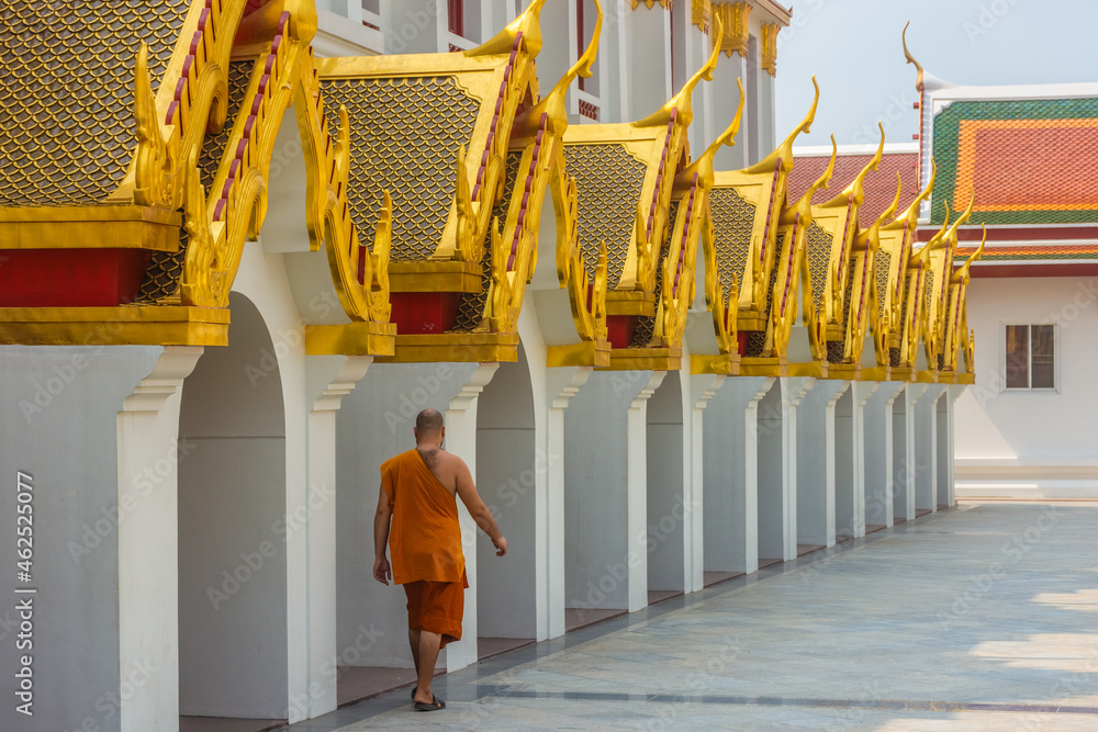 BANGKOK, THAILAND, 12 JANUARY 2020: Monk walking in the Loha Prasat Temple, also called the "Metal Castle"