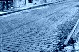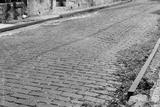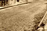 Old red brick street in running bond pattern, crumbling aggregate sidewalks with rusty metal curb caps, horizontal aspect