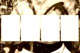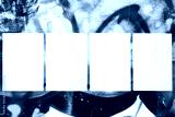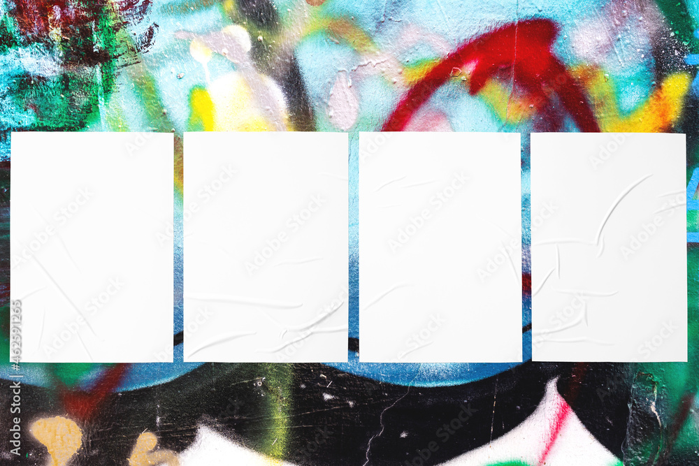 Closeup of colorful messy painted urban wall texture with four wrinkled glued poster templates. Modern mockup for design presentation with clipping path. Creative urban city background.