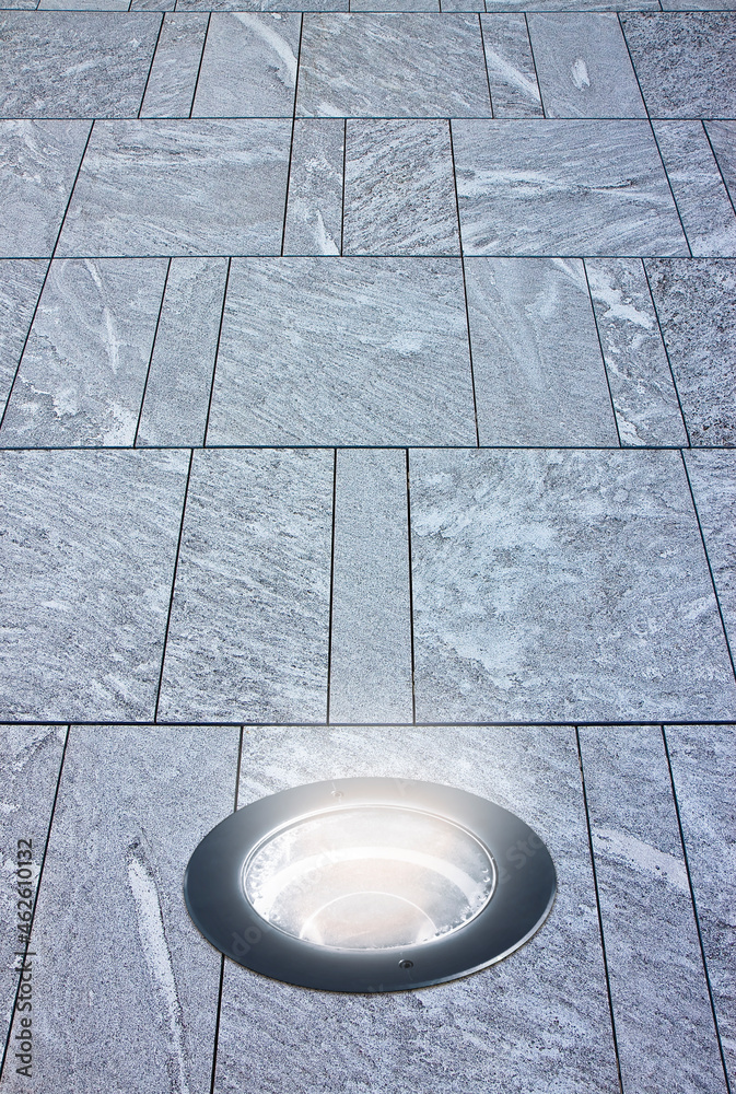 Recessed modern floor lamp, in circular shape, on a new stone pavement in a pedestrian zone