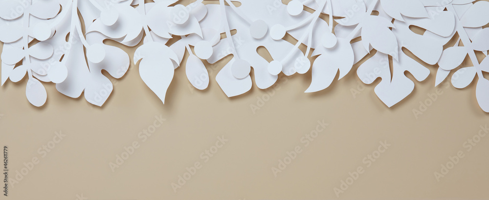 Neutral pastel beige banner with beautiful floral white paper cut art. Flat lay, copy space
