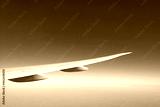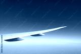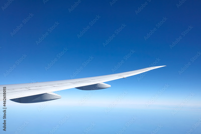 Airplane wing against the blue sky, travel and transport concept, space for text.