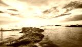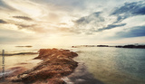 Scenic sunset at a rocky beach in Bentota, Sri Lanka.