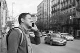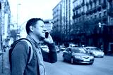 Young man walking on the street and talking by phone.