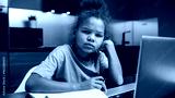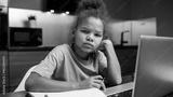 Sad biracial little girl looking at camera while doing homework at home. Upset kid struggling with difficult task using laptop. Distance education and online learning at quarantine concept