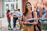 Portrait of happy female university student looks at camera.