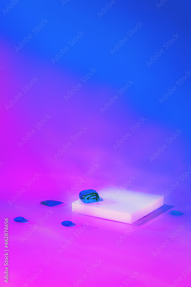 Abstract surreal scene - empty stage with white square podium on holographic neon pink colored background. Pedestal for cosmetic, beauty product, packaging mockups display presentation