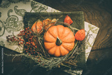 Autumn decoration with orange mini pumpkin and physalis blossoms on dark wood, top view