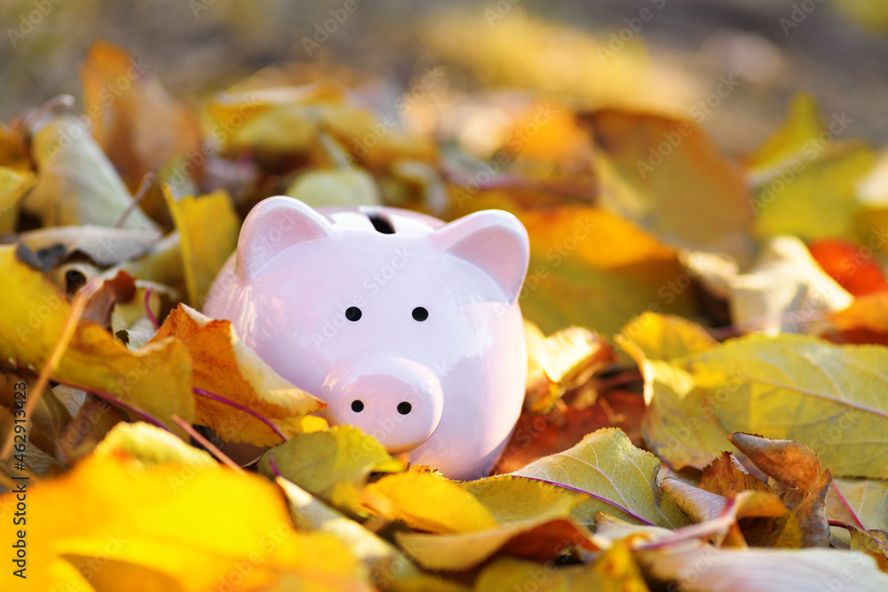 .Pink piggy Bank in autumn leaves on the ground. Banking concept in autumn time