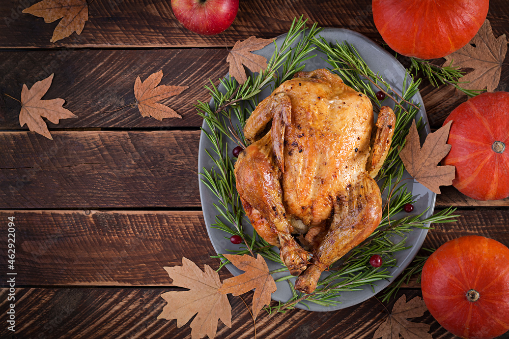 Roasted turkey garnished with cranberries on a rustic style table decorated with pumpkins, apples and autumn leaf. Thanksgiving Day. Flat lay. Top view