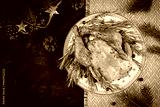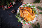 Baked chicken or turkey. The Christmas table is served with turkey, decorated with bright tinsel. Fried chicken, table. Christmas dinner. Table setting. Top view, above