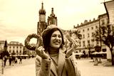 Woman eating bagel obwarzanek traditional polish cuisine snack on Market square in Krakow. Travel Europe in autumn