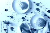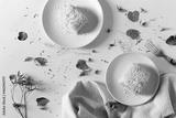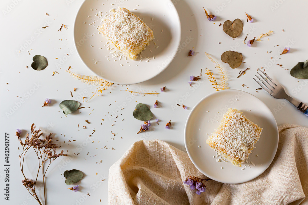 Breakfast beige cozy composition with coconut cake. Flat lay, top view