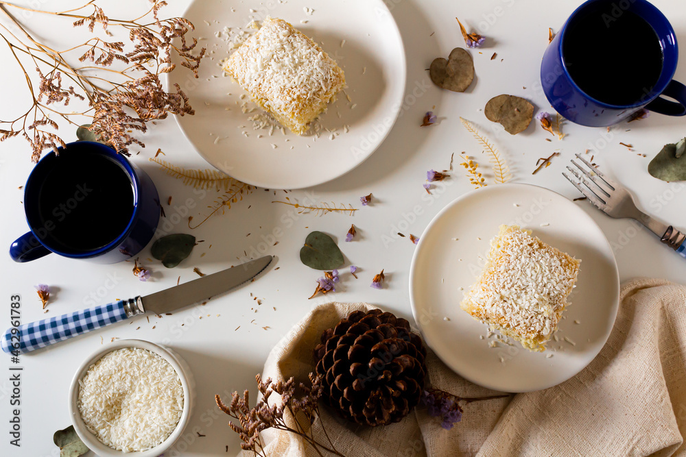 Breakfast beige cozy composition with coconut cake. Flat lay, top view
