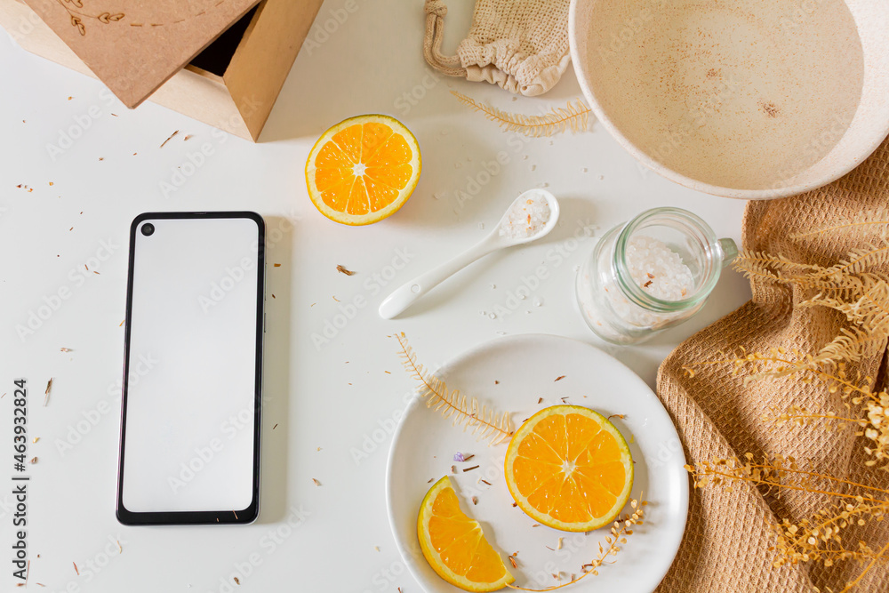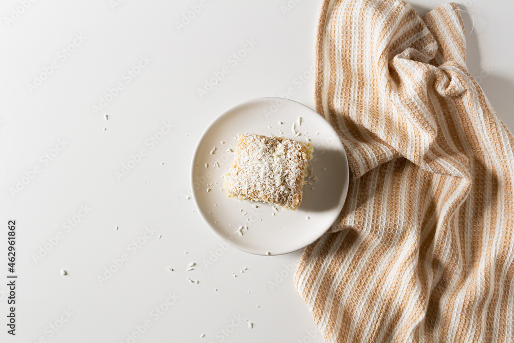 Breakfast beige cozy composition with coconut cake. Flat lay, top view