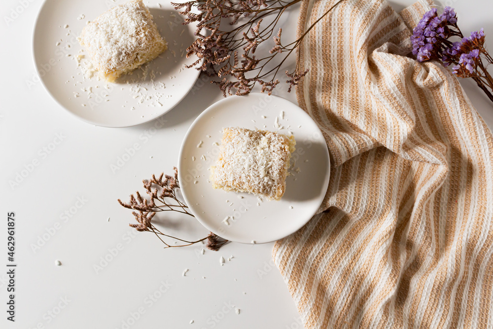 Breakfast beige cozy composition with coconut cake. Flat lay, top view