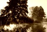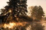 Drzewa nad rzeką, światło we mgle, rzeka Czerniawka, Staw w Białej, gmina Zgierz