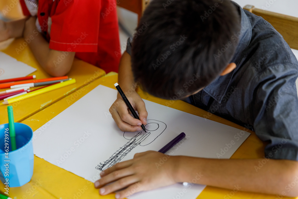Asian children hands holding colored pencils painting on art drawing paper in classroom at summer school