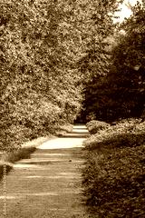 quiet walking trail in the park surrounded by dense green foliage on a sunny day