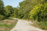 quiet walking trail in the park surrounded by dense green foliage on a sunny day