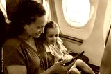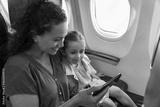 Happy mother holding mobile phone and looking at the screen while traveling with her daughter on an airplane