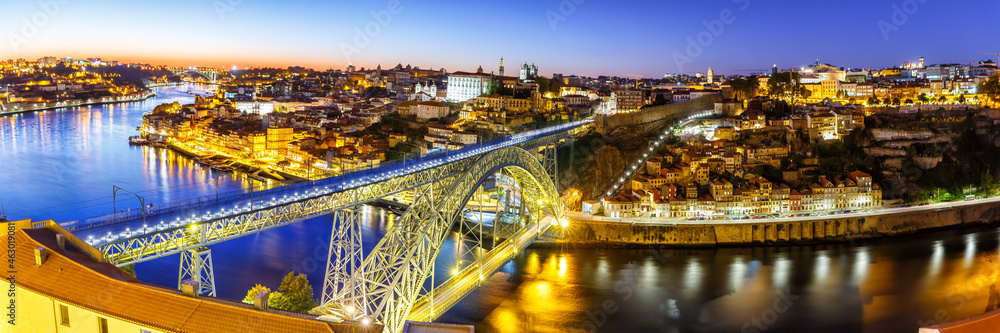Porto Portugal with bridge Ponte Dom Luis I Douro river town travel panorama at twilight