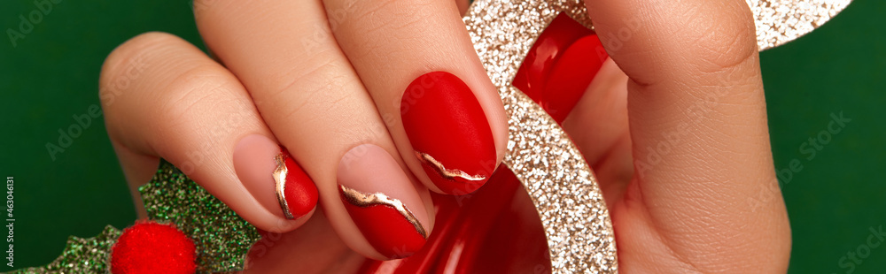 Womans hand with fashionable red manicure close up. Manicure, pedicure beauty salon concept.
