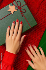 Womans hands with trendy red manicure with gift box on knitted blanket. Manicure, pedicure beauty salon concept.