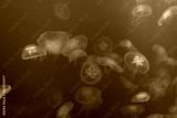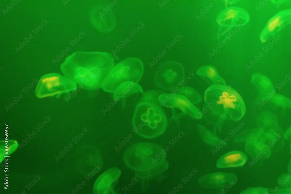 Aurelia jellyfish in green water, blurred image, no focus