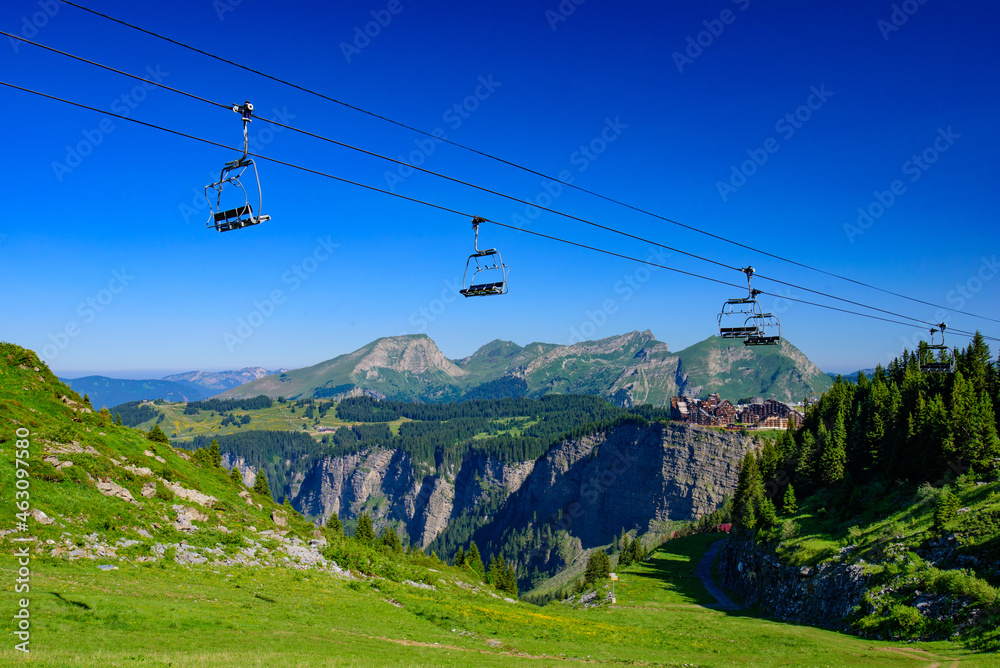View of Avoriaz in summer with gondola lift, a mountain resort in Portes du Soleil, France, Europe