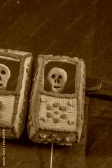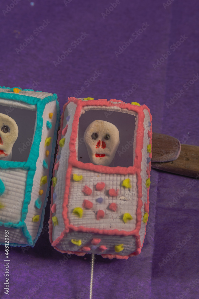 Coffins with sugar cane, typical Mexican sweets made from alfeñique, made for the celebration of Día de Muertos, specifically for the traditional Alfeñique Fair.