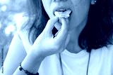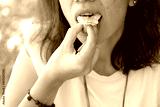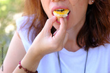 Woman eating bread with fresh egg for breakfast, young woman eating food.