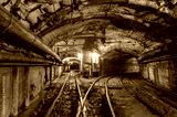 Underground mine. Underground railway for transporting ore. Mine trolley as part of an underground freight train