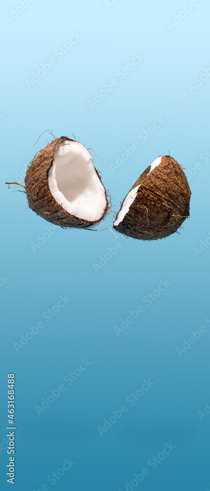 Falling coconut split on half. 21:9 aspect ratio. Blue background