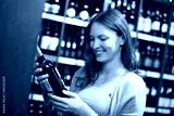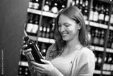 Frau betrachtet Weinflasche