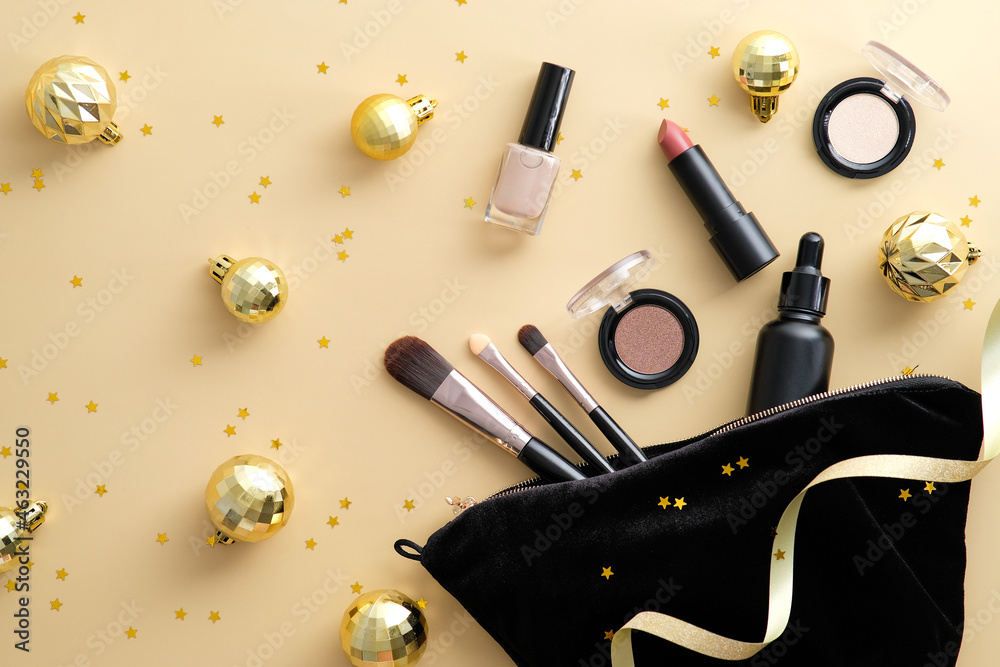 Cosmetic bag with makeup tools and beauty products on pastel beige background decorated gold Christmas balls and confetti. Flat lay, top view.
