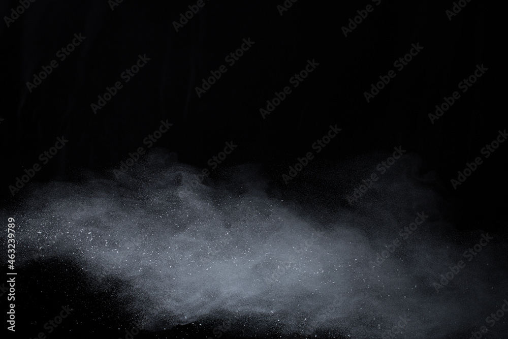 White powder explosion on black background. Colored cloud. Colorful dust explode. Paint Holi.