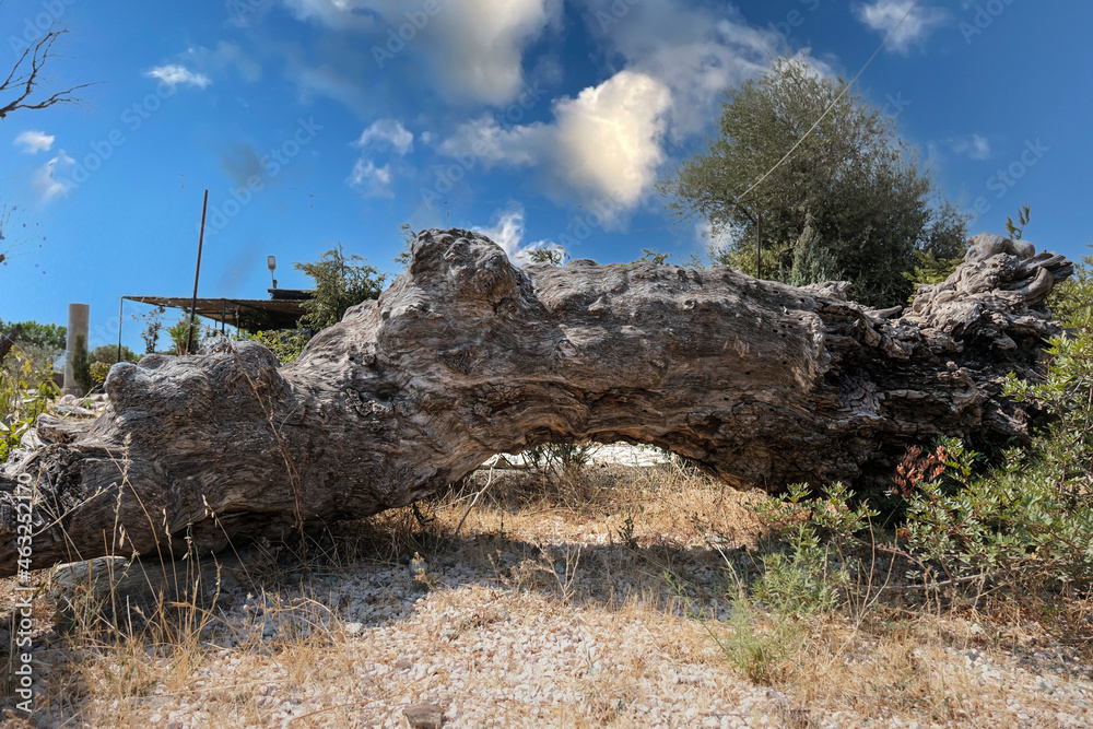 Fallen tree trunk blocking the road. The end of the road concept, no exit, no more way. Beautiful landscape on rural area with old ruined tree. Selective focus.