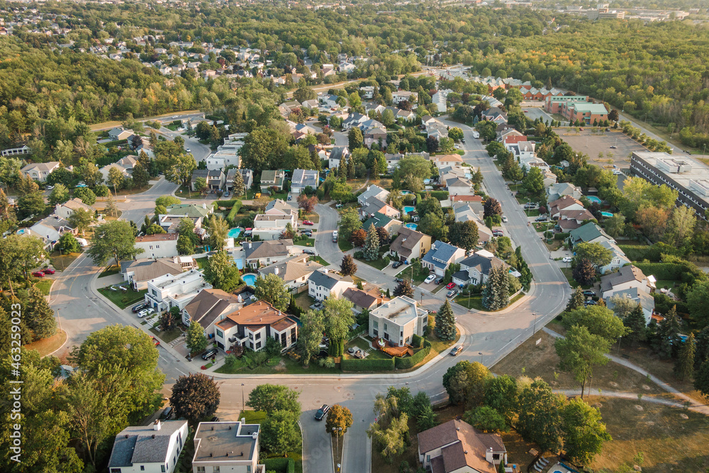 Aerial view of houses and streets in beautiful residential neighbourhood in Montreal, Quebec, Canada, North America. Property, homes and real estate concept, summer season.