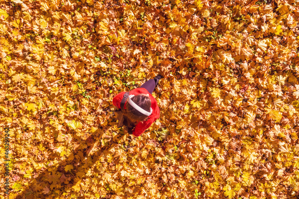 Top view. Beautiful young woman in red sweater and headphones listening music walking with backpack in autumn park covered of maple leaves Aerial, drone view