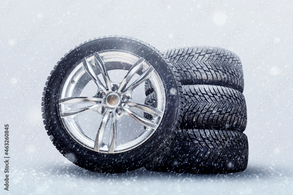 winter studded tires, a set of friction winter wheels with aluminum alloy wheels on a white background. falling snow is a safety concept about seasonal tire change for safety on the road in icy