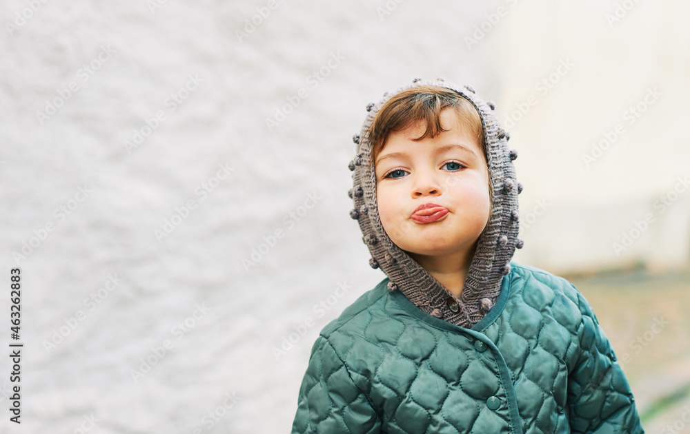 Outdoor portrait of funny toddler girl pulling a tongue