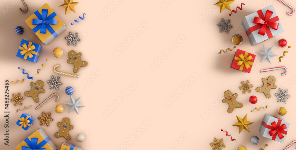 Christmas gifts and ornaments whit copy space, merry christmas and happy new year concept
