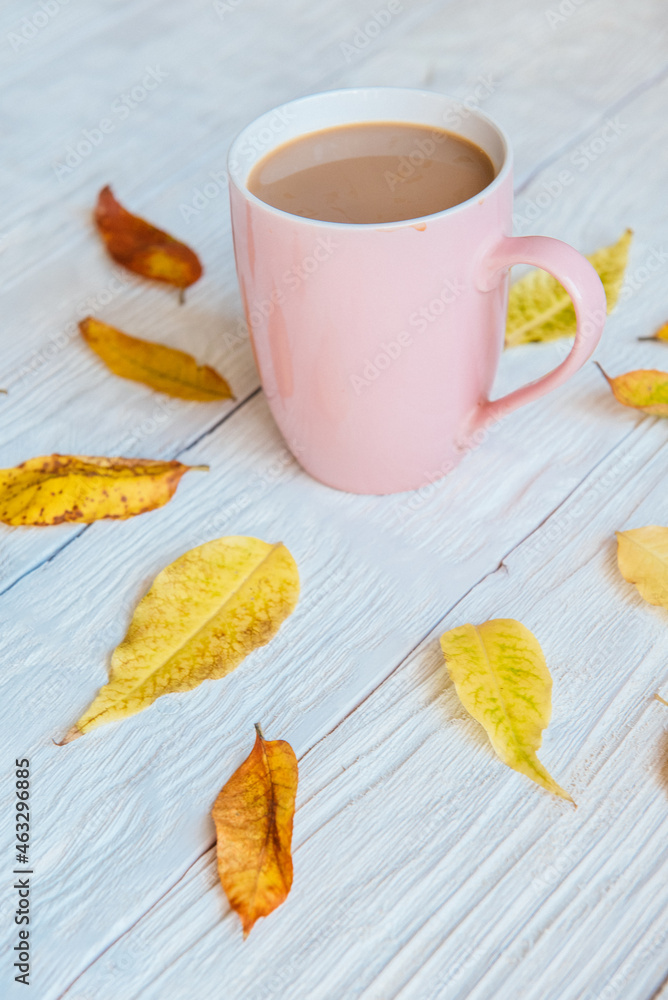 Coffee cup and yellow autumn leaves background. Still life, top of view, flat lay.